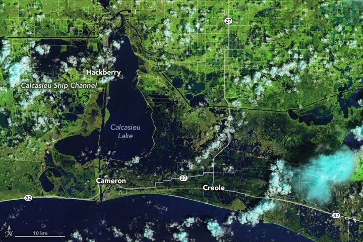 Laura made landfall as a category 4 storm late on August 26, 2020, bearing sustained winds of 150 miles (240 kilometers) per hour and storm surges ranging from 9 to 15 feet (3 to 5 meters). The storm dropped 5 to 10 inches of rain on several areas in Louisiana, Texas, and Arkansas. In the wake of the storm, the Operational Land Imager (OLI) on Landsat 8 acquired images of flooded coastal lands around the towns of Cameron and Creole, Louisiana, south of the city of Lake Charles (population 78,000).
