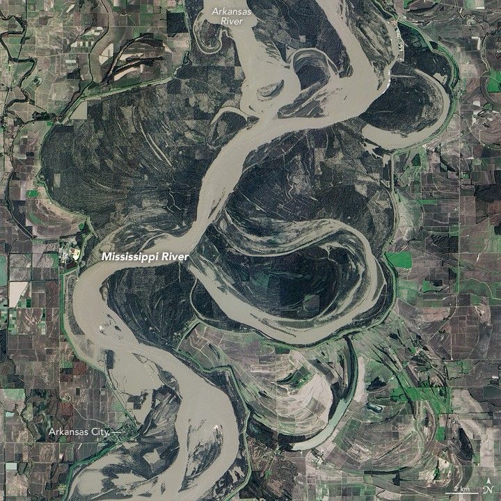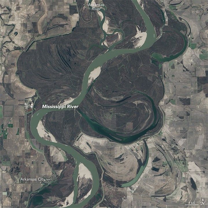 In December 2015, torrential rains in parts of Missouri and Illinois led to severe flooding along the Mississippi River. The pulse of water that began in the river’s northern reaches eventually flowed all the way to Louisiana and the Gulf of Mexico. The area between those two areas also saw river levels rise; the images above show flooding that occurred at the confluence of the Arkansas and Mississippi rivers.