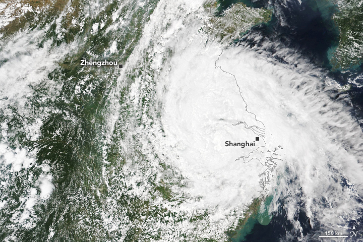 This image, acquired at 1:45 p.m. local time (5:25 a.m. Universal Time) on July 27, 2021, with the Visible Infrared Imaging Radiometer Suite (VIIRS) on the NOAA-NASA Suomi NPP satellite, shows the storm moving inland toward the northwest. In-fa has weakened to a tropical storm and will continue to break up in the coming days. But the slow-moving storm continues to unleash torrential rain and could soon escalate the flooding situation in Henan province.