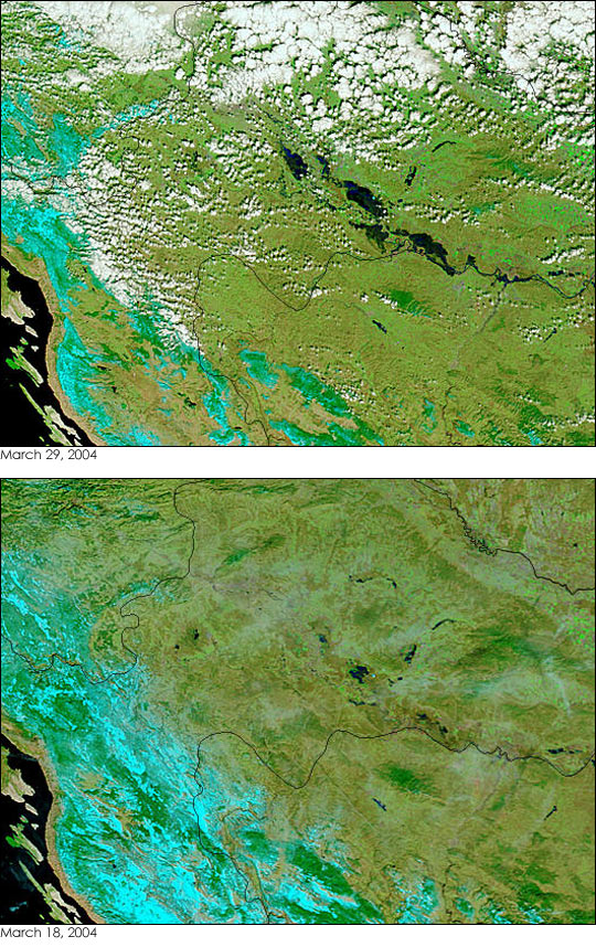 Inky black splotches along Croatiaâs Sava River show where the river has expanded in a springtime flood. The Moderate Resolution Imaging Spectroradiometer (MODIS) on the Terra satellite recorded the top scene on March 29, 2004. The region had recently been inundated with heavy rains, which undoubtedly were partially responsible for the floods. However, a Terra MODIS image taken on March 18, hints that melting snow also contributed to the rising waters. On March 18, snow, shown in light blue in the false-color scenes, covered the Dinaric Alps along the Adriatic Sea. By March 29, most of the snow was gone.