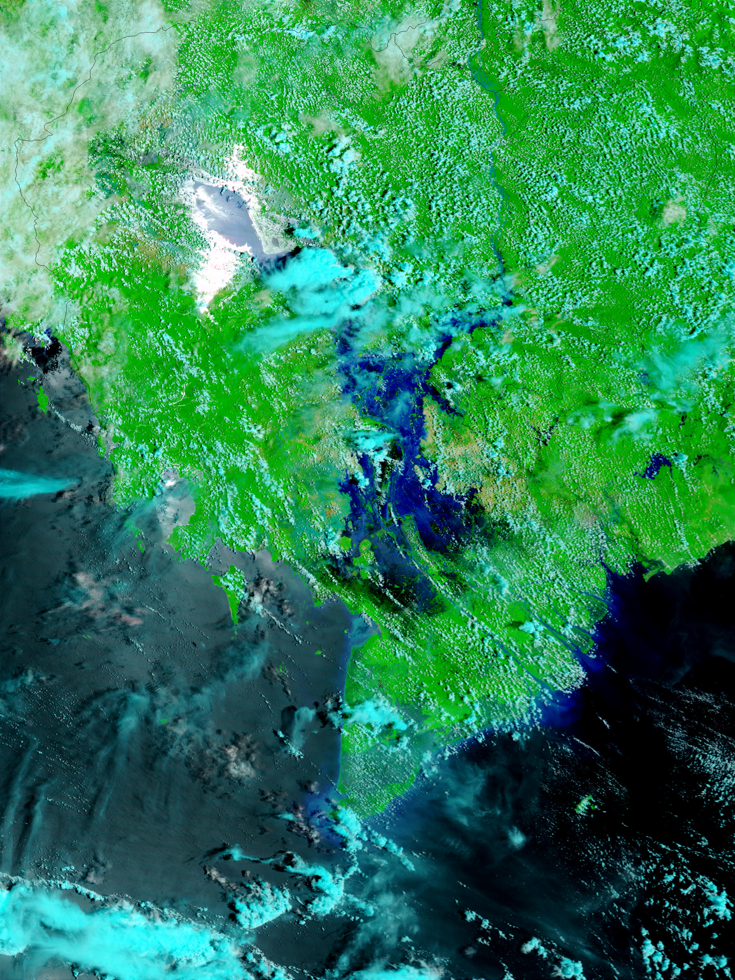 The Mekong River travels south from the China-Lao border, through the Indochina Peninsula, and empties out into the South China Sea at the lower right-hand corner of the image. This year both heavy rains in Indochina and run-off from massive floods in China have led to flooding of the Mekong River. As can be seen in the center of the image, the river delta now resembles a lake straddling the border of Vietnam and Cambodia.