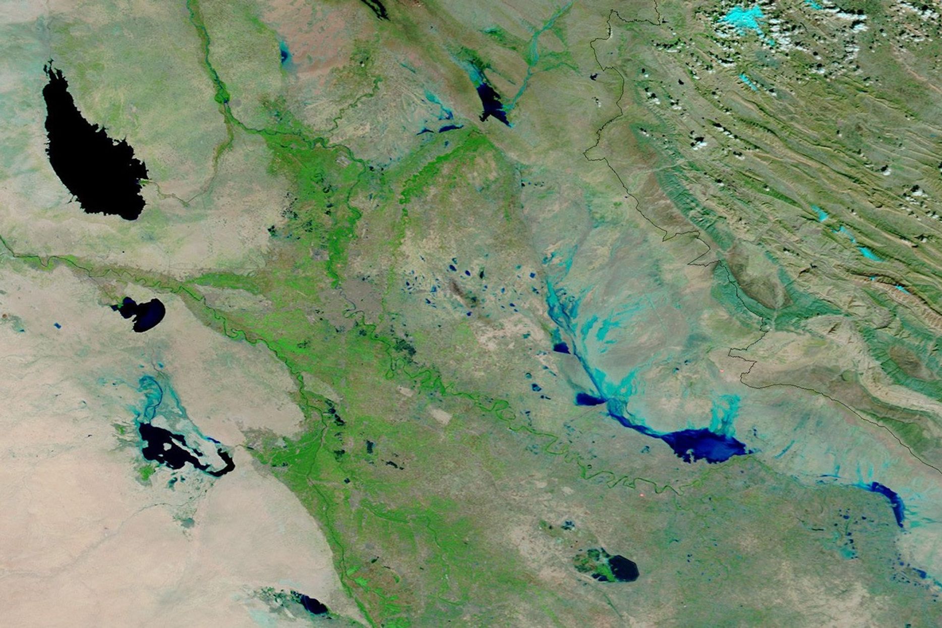 On November 11, 2015, the Moderate Resolution Imaging Spectroradiometer (MODIS) on NASA’s Terra satellite captured an image (second) of flooding in Iraq. The top image shows the same area on October 12, before the storm passed through.