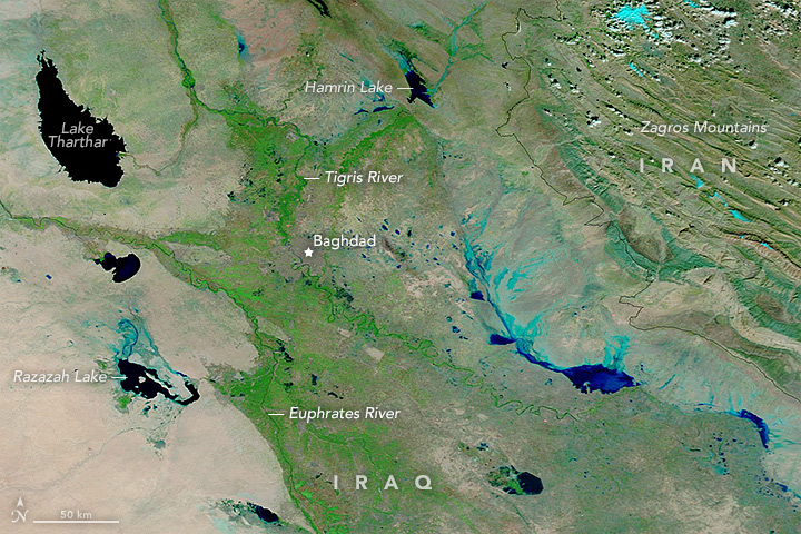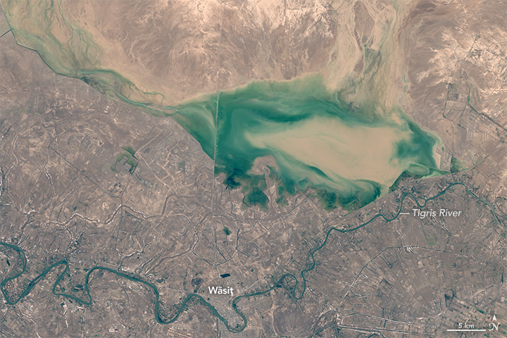 On November 14, 2015, the Operational Land Imager (OLI) on Landsat 8 captured an image (bottom of the page) that shows flood waters north of the Tigris River near the town of Wāsit (also called Kut); Landsat acquired an image of the same area on October 13, 2015, before the flooding. Though some farmland appears to be flooded, most homes in and around Wāsit appear to be protected by a flood barrier.