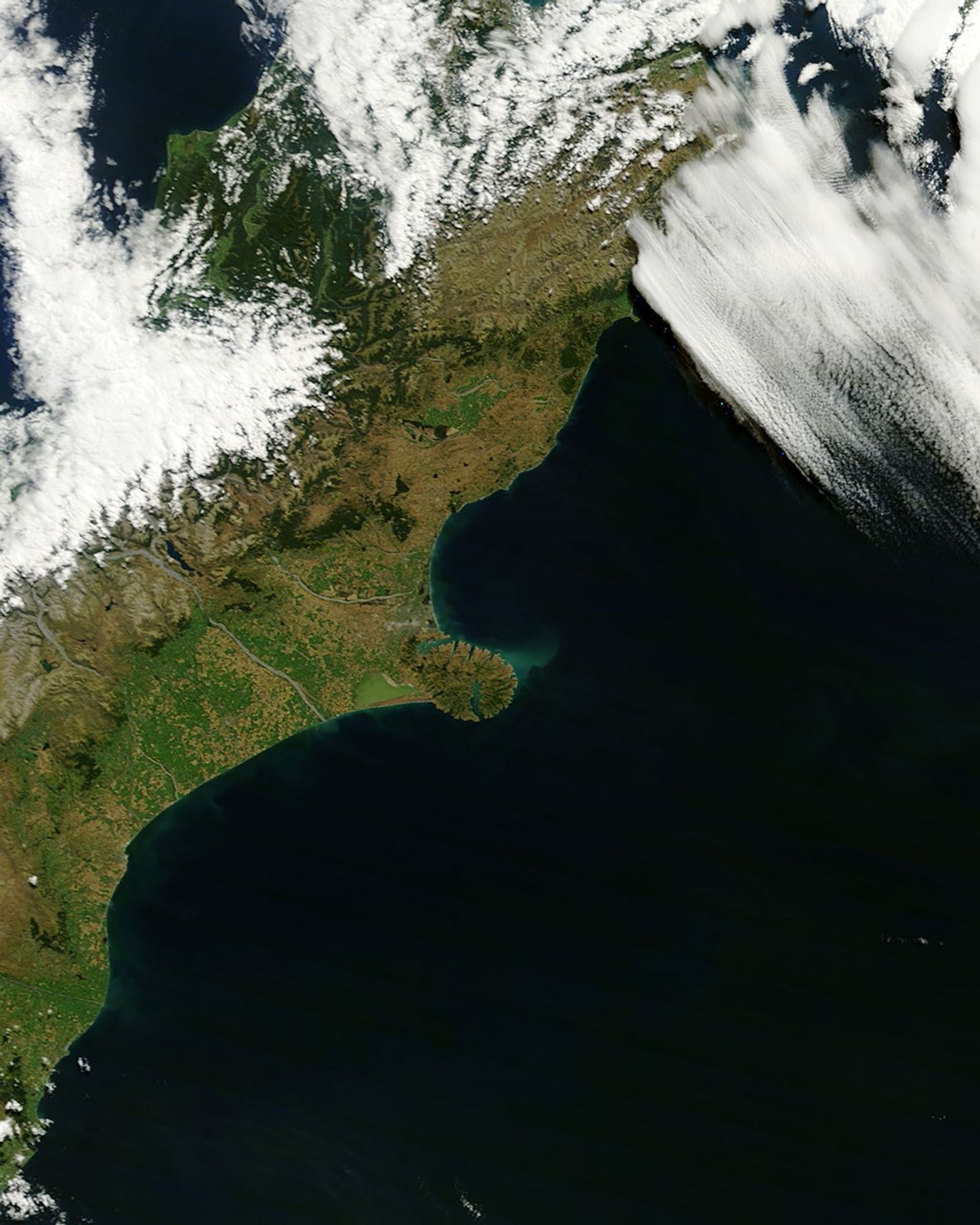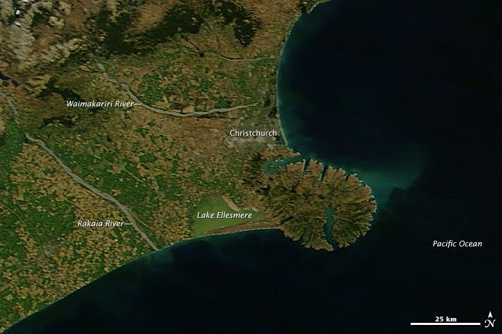 The surge of rainfall caused rivers—including the Waimakariri, Rakaia, Heathcote, and Avon—to swell with what appeared to be sediment-rich water. Skies had cleared enough by March 6, 2014, for the Moderate Resolution Imaging Spectroradiometer (MODIS) on NASA’s Aqua satellite to acquire this image showing the aftermath. While it’s not possible to make out patches of standing water in Christchurch, the large amount of suspended sediment flowing out from the rivers made dark blue coastal waters appear tan. The aquamarine patterns farther offshore are likely caused by suspended marine-based calcite sediment that was lofted up from the sea bottom by waves produced during the storm. The lower image, acquired by MODIS on February 22, 2014, shows the same area before the storm.