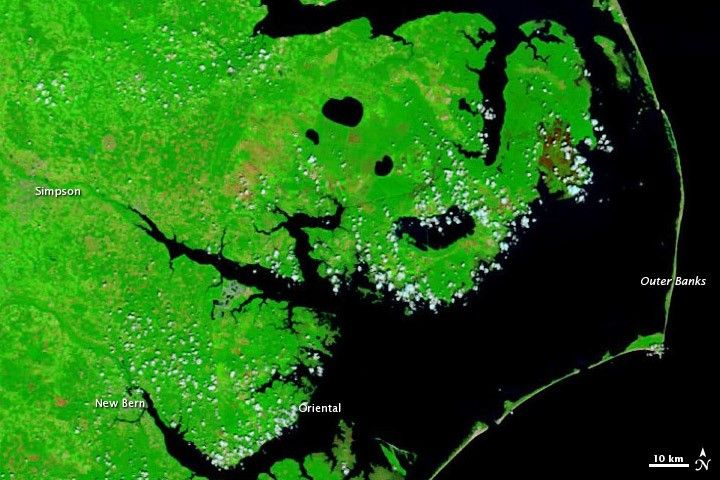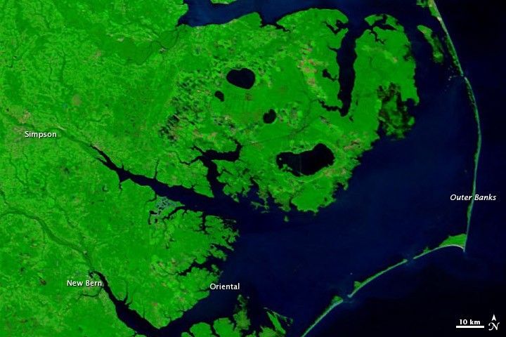 A close look at these images reveals another difference along the Outer Banks. Tan-colored sandy areas, particularly east of Oriental, can be discerned on August 16. On August 28, those areas are blue, indicating that the sand is either saturated or flooded.