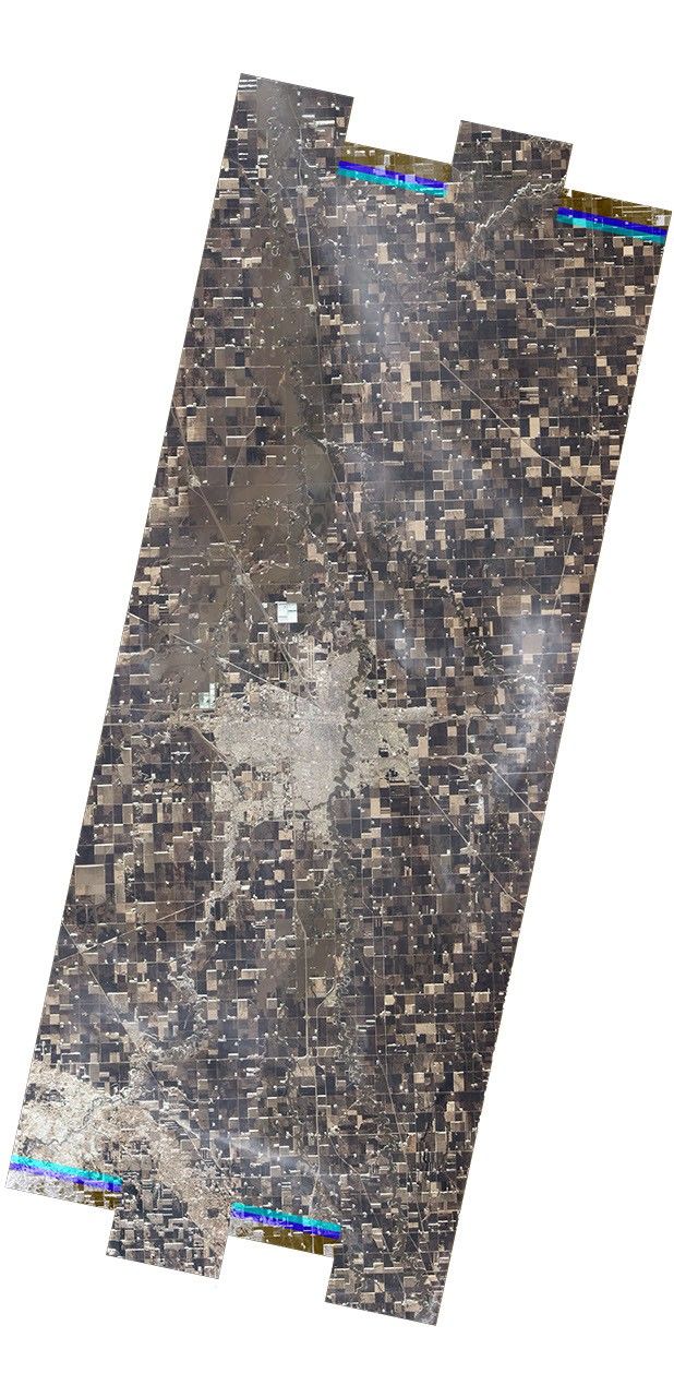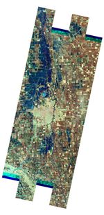 The Advanced Land Imager (ALI) on NASA’s Earth Observing-1 (EO-1) satellite captured these images of fields north of Fargo on March 21, 2010. The Sheyenne, Red, and Buffalo Rivers all flow through the area pictured here. The false-color image (top) combines visible and infrared light to make standing water (dark blue) more obvious. Fallow fields, bare ground, and paved surfaces appear in shades of brown, while vegetation is green. Cyan strips along the edges of fields and rivers may be patches of snow and ice. In the natural-color image (bottom), muddy water and fallow fields blend together.