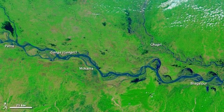 The Moderate Resolution Imaging Spectroradiometer (MODIS) on NASA’s Terra satellite captured these images of the Ganges (or Ganga) River between Patna and Bhagalpur; as well as the Ghugri River, a Ganga tributary. The top image is from October 8, 2011, and the bottom is from October 10, 2010. Both images use a combination of infrared and visible light to increase contrast between water and land. Water ranges from electric blue to navy. Vegetation is green. Bare ground is earth-toned. Clouds are pale blue-green.