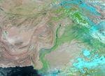 The Moderate Resolution Imaging Spectroradiometer (MODIS) on NASA’s Aqua satellite captured these images on August 8, 2010 (top), and July 18, 2010 (bottom). The images show the lower Indus River, not far from Pakistan’s coast. Both images use a combination of infrared and visible light to increase the contrast between water and land. Water appears in varying shades of blue. Vegetation is green and bare ground is pinkish brown. Clouds range in color from pale blue-green to bright turquoise.