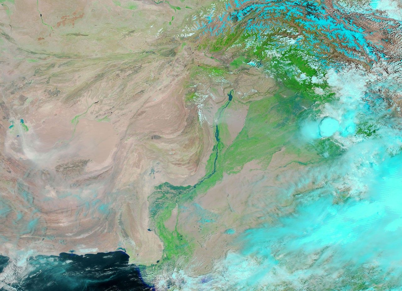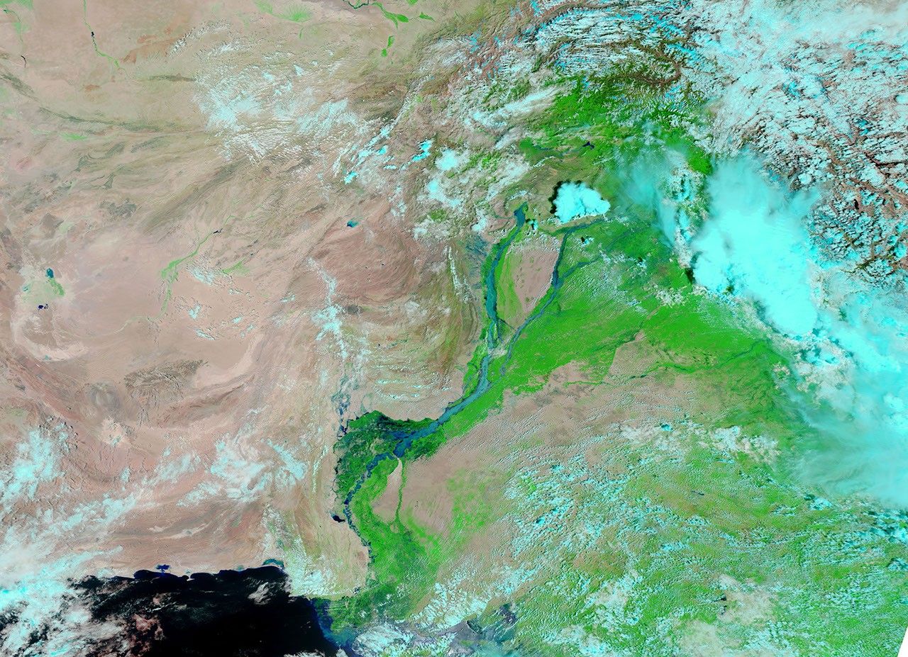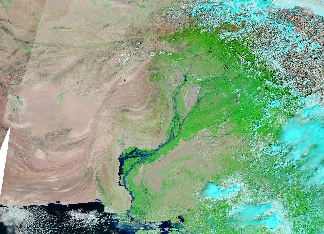 These images from the Moderate Resolution Imaging Spectroradiometer (MODIS) on NASA’s Terra satellite show the bend in the Indus River where waters diverged during the 2010 monsoon season. The images span a 50-day period from July 19, before flooding was apparent along the lower Indus to September 7, after flood waters extended to Manchhar Lake.