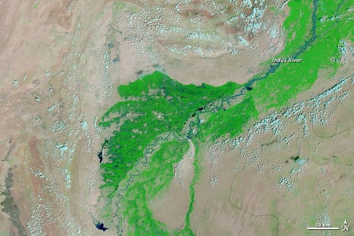 These images compare conditions along the Indus River where the borders of Punjab, Balochistan, and Sindh meet. In this region, a network of levees and canals distributes Pakistan’s normally scarce water resources. Acquired by the Moderate Resolution Imaging Spectroradiometer (MODIS) on NASA’s Terra satellite, the top image shows flooded conditions on September 13, 2012, and the bottom image shows more normal conditions on September 1, 2012.