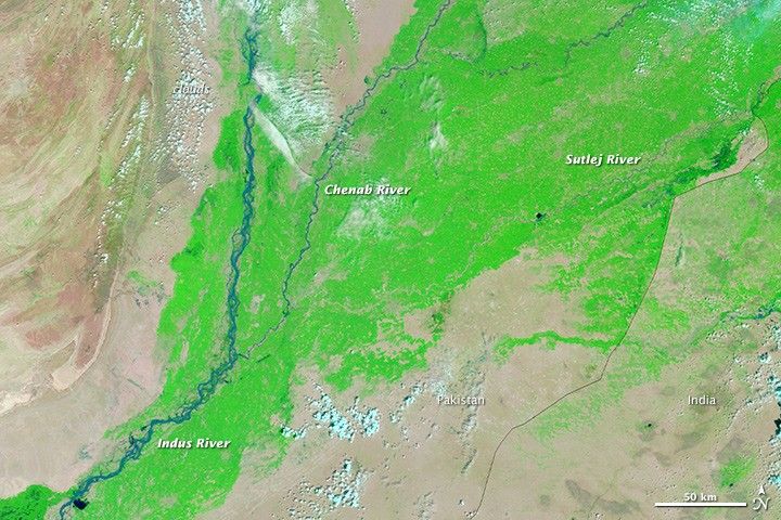 Each summer, monsoon rains sweep across southwestern Asia, soaking India and Bangladesh. In nearby Pakistan, the rains are usually less intense, more intermittent, and centered in the northeast.