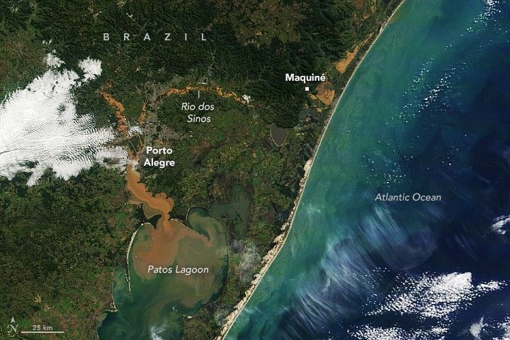The Moderate Resolution Imaging Spectroradiometer (MODIS) on NASA’s Terra satellite acquired these natural-color images before and after the storm (left and right, respectively). The right image shows the affected area on June 19, 2023, three days after the storm. Sediment-rich water overtopped the banks of the Rio dos Sinos, inundating large stretches of farmland. Mud-stained runoff can be seen flowing into the Patos Lagoon, south of Porto Alegre.