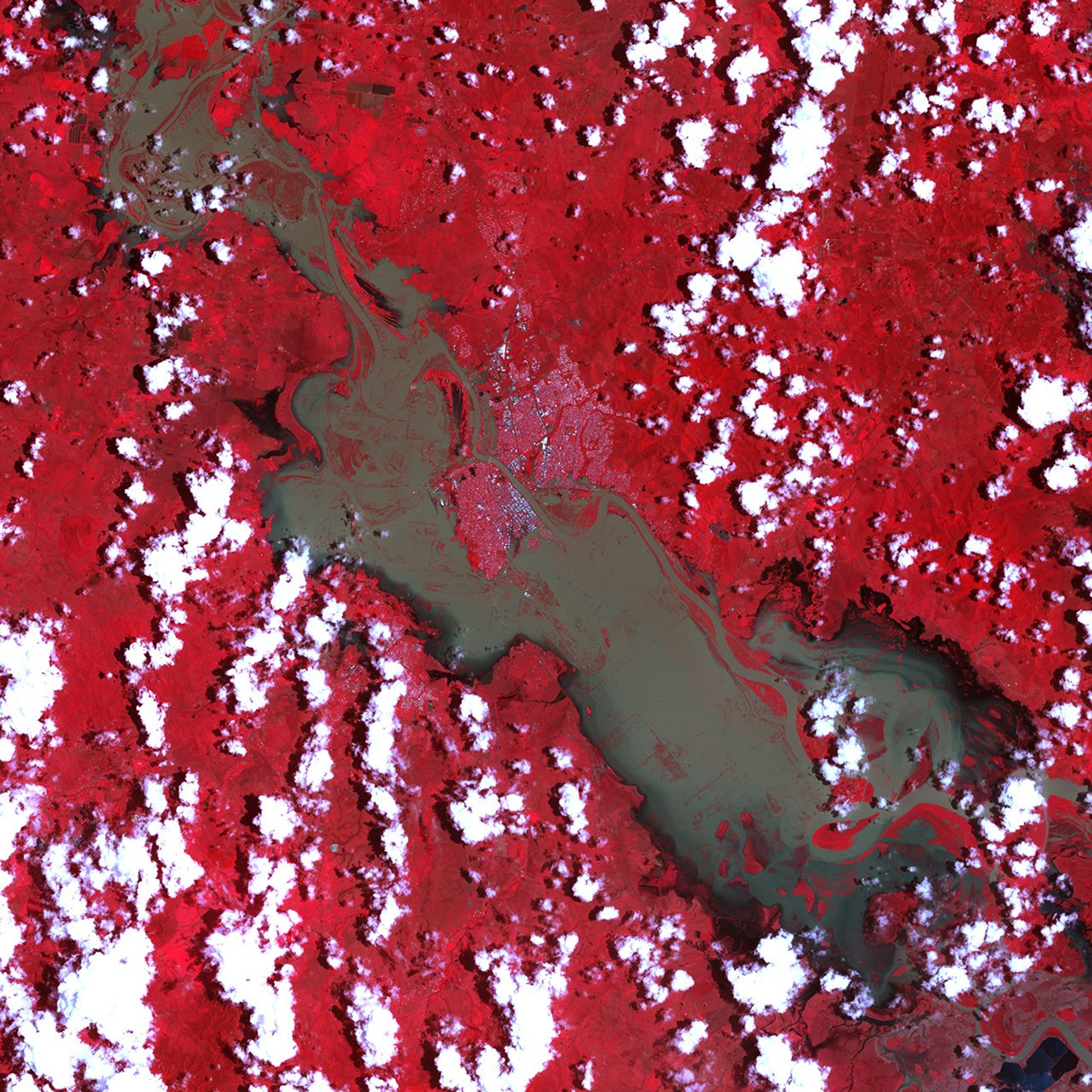 Though water levels had started to subside, the Australian city of Rockhampton was still inundated when the Advanced Spaceborne Thermal Emission and Reflection Radiometer (ASTER) on NASA’s Terra satellite took this image on January 7, 2011. The image includes both infrared and visible light to increase the contrast between muddy floodwater and brown earth. Reflective surfaces on buildings make the city shine white against a background of plant-covered land (which shows up as red). Sediment-loaded water is brown, while clearer water is black.