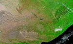 Compared to 2010, a general green-up is apparent in 2011. In 2010, the Orange River is easily spotted, thanks to the bright green riverbanks lined with irrigated crops and the relatively brown land nearby. In 2011, clouds partially obscure the river, which is less conspicuous because so much of the region has turned green. North of Brandvlei in 2011, standing water sprawls over large areas that had been dry a year before.