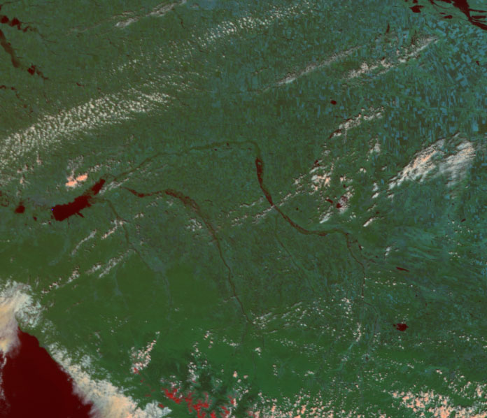 In this false-color image, the ground is green and blue and water is black or dark brown. Clouds come across as pink and white.