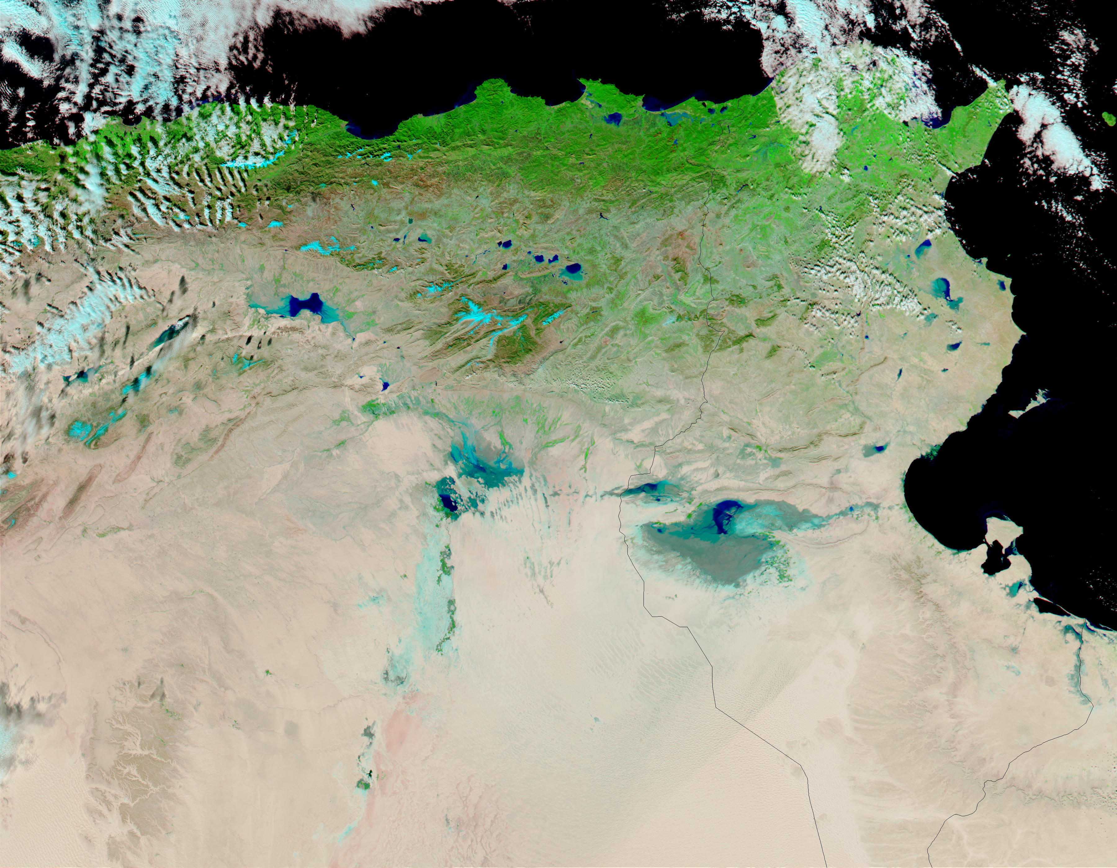 Normally, the salt pans of Tunisia and Algeria contain little or no water (top, acquired January 4, 2003). In this false-color image water is blue and black. Snow, which has also fallen in unusual abundance in the higher altitudes, appears as a bright cyan and can be seen along the Algeria mountains and ridges. Clouds appear as pale blue and white, and land is green and tan.