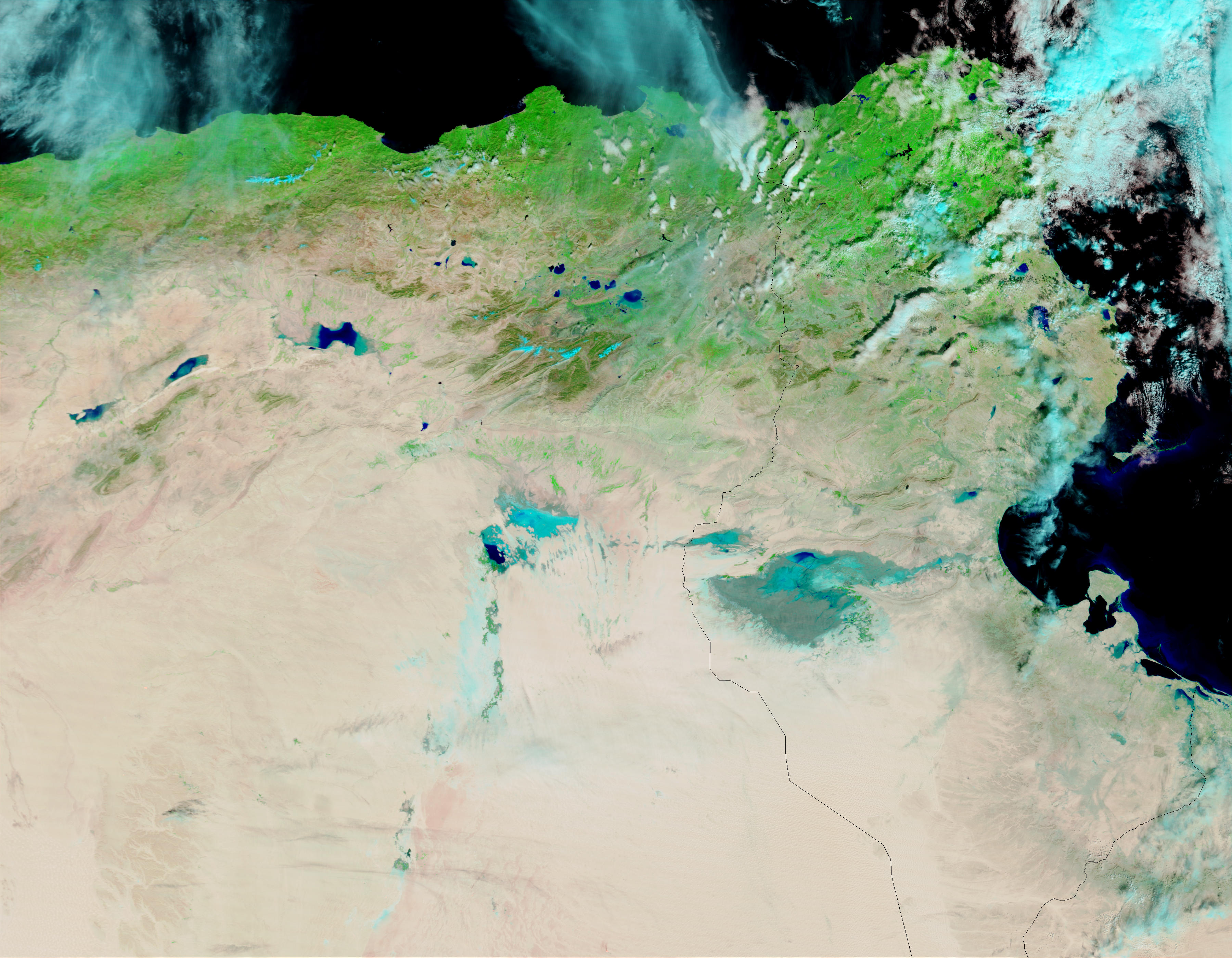 During the dry season, the salt pans of Tunisia and Algeria contain little or no water. In this false-color image water is blue and black. Snow, which has also fallen in abundance in the higher altitudes, appears as a bright cyan and can be seen along the Algeria mountains and ridges. Clouds appear as pale blue and white, and land is green and tan.