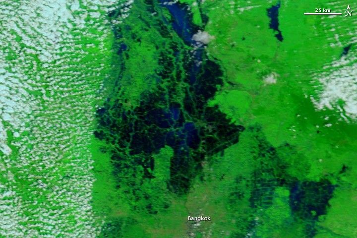Thailand’s climate is normally rainy and warm, and water is abundant north and east of the city in 2008. In 2011, however, the same areas are inundated, with water spanning more than 75 kilometers (45 miles) in places.