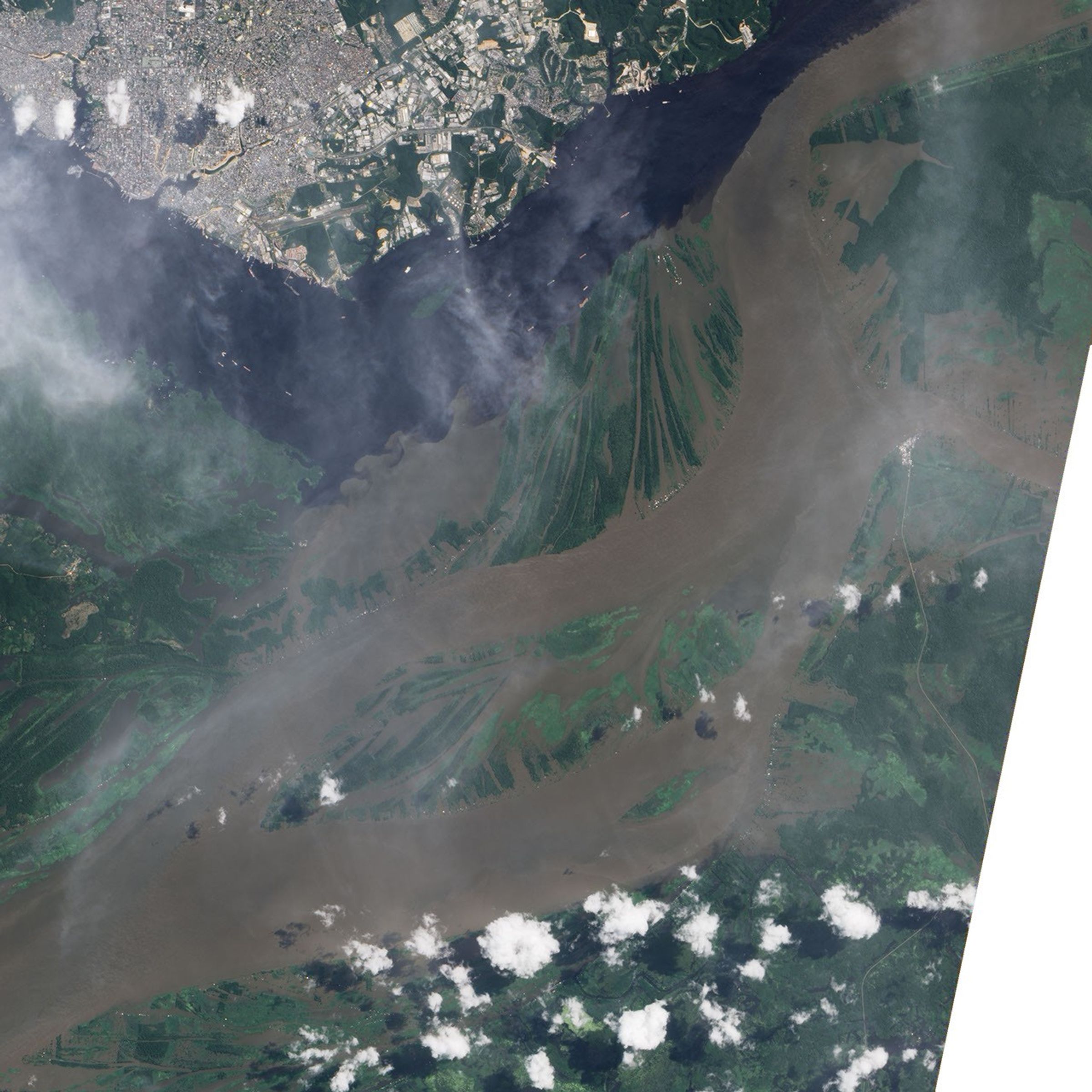 In June 2009, the waters of the Amazon surrounded villages that had stood on dry land in June 2004. The water seems to seep into the cleared land, filling what had been pale green, angular shapes with murky brown water. It is quite likely that the flood actually extended across the entire land between the two rivers, but the dense forest canopy rises above the water, hiding the floods beneath. Only where the land has been cleared is the flood fully visible. The 2009 scene is slightly blurred by a thin layer of cloud.