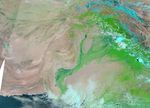 The Moderate Resolution Imaging Spectroradiometer (MODIS) on NASA’s Terra satellite captured these images on August 4, 2010 (top), and August 3, 2009 (bottom). These images show the region between Islamabad and Peshawar. Both images use a combination of infrared and visible light to increase the contrast between water and land. Water varies in color from electric blue to navy. Vegetation is green and bare ground is pinkish brown. Clouds range in color from nearly white to pale blue-green.