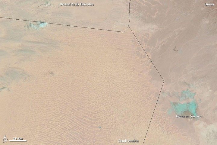 The flood water might have flowed into the region from the southwestern Empty Quarter, and from the mountains of Oman. Ground water often feeds perennial lakes in this region, and in April 2012, Umm as Samim might have been both a destination for flood water flowing over the surface and a source of upwelling ground water.