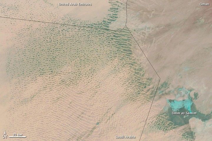The flood water might have flowed into the region from the southwestern Empty Quarter, and from the mountains of Oman. Ground water often feeds perennial lakes in this region, and in April 2012, Umm as Samim might have been both a destination for flood water flowing over the surface and a source of upwelling ground water.