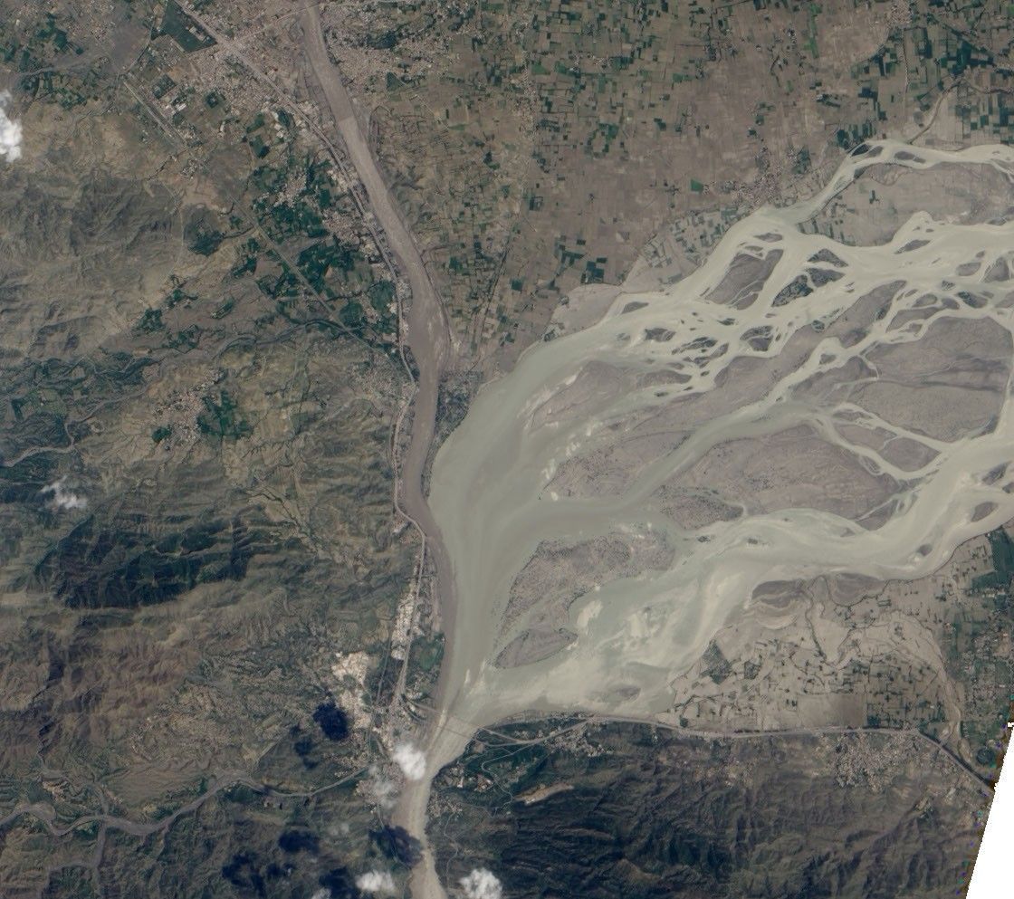 Besides mud and debris, some floodwaters remained on August 5, 2010, when the Advanced Land Imager (ALI) on NASA’s Earth Observing-1 (EO-1) satellite captured this natural-color image. This image shows the area where the Kabul and Indus Rivers meet, near the city of Khairabad. Both rivers appear clogged with sediment, and the Indus River has overtopped its banks in multiple locations. Just east of the confluence, the usually thin braided streams of the Indus River sprawl over the floodplain, spanning close to a kilometer in spots. Southeast of the Indus, muddy water stands on agricultural fields.