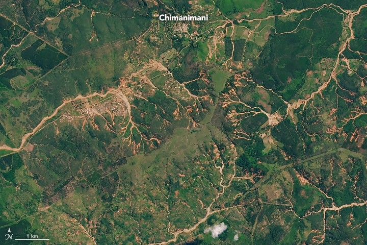 According to reports from the International Charter, Zimbabwe’s most affected area was the Chimanimani District—a mountainous area close to the border with Mozambique. Widespread changes are visible in these images from before and after the storm; the Operational Land Imager (OLI) on Landsat 8 acquired the images.