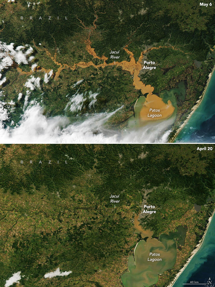 The MODIS (Moderate Resolution Imaging Spectroradiometer) on NASA’s Terra and Aqua satellites acquired these images (below) on May 6 and April 20, during and before the flooding. Water overtopped the banks of the Jacuí, Cai, and Sinos rivers, inundating parts of Porto Alegre, the state’s capital city. Floodwater also spilled into several other cities, towns, and farmland upriver. Runoff, stained brown with suspended sediment, is visible flowing into the Patos Lagoon, south of Porto Alegre.