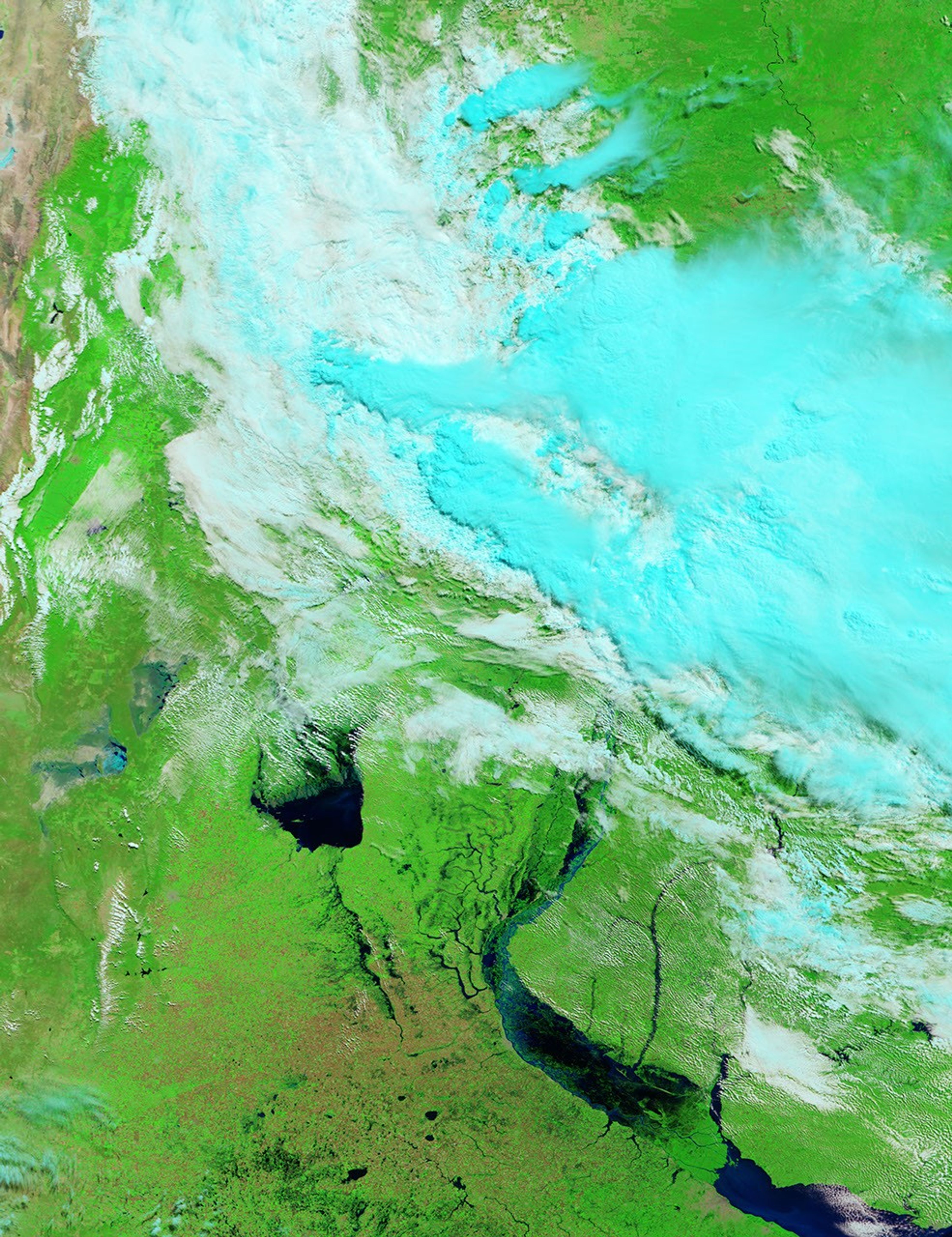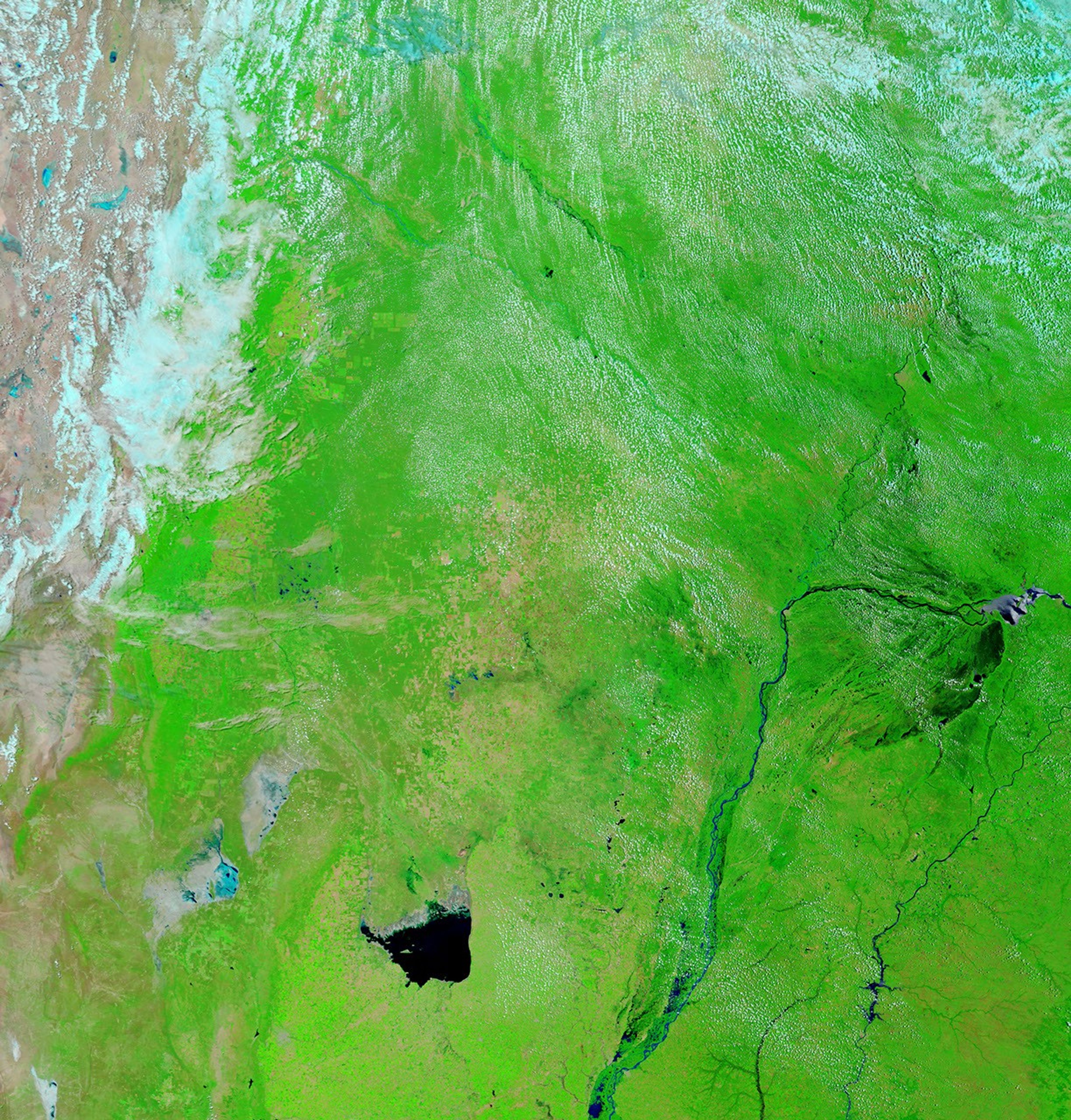 Dark bands of water encroach on the cities in the top image. The lower image, taken on January 13, 2007, before the unusually heavy late-summer rains began, shows the river and its tributaries under dry-season conditions. Both images were made from infrared and visible light to highlight the presence of water, which is black or dark blue in this type of image. Clouds are light blue and white, plant-covered land is green, and bare ground is tan-pink. The variegated green and tan land on either side of the river is agricultural land. In contrasting the two images, it is clear that not only have the wetlands and rivers expanded in the April 3 image, but tiny flecks of black in between the rivers indicate that farmland is flooded as well.