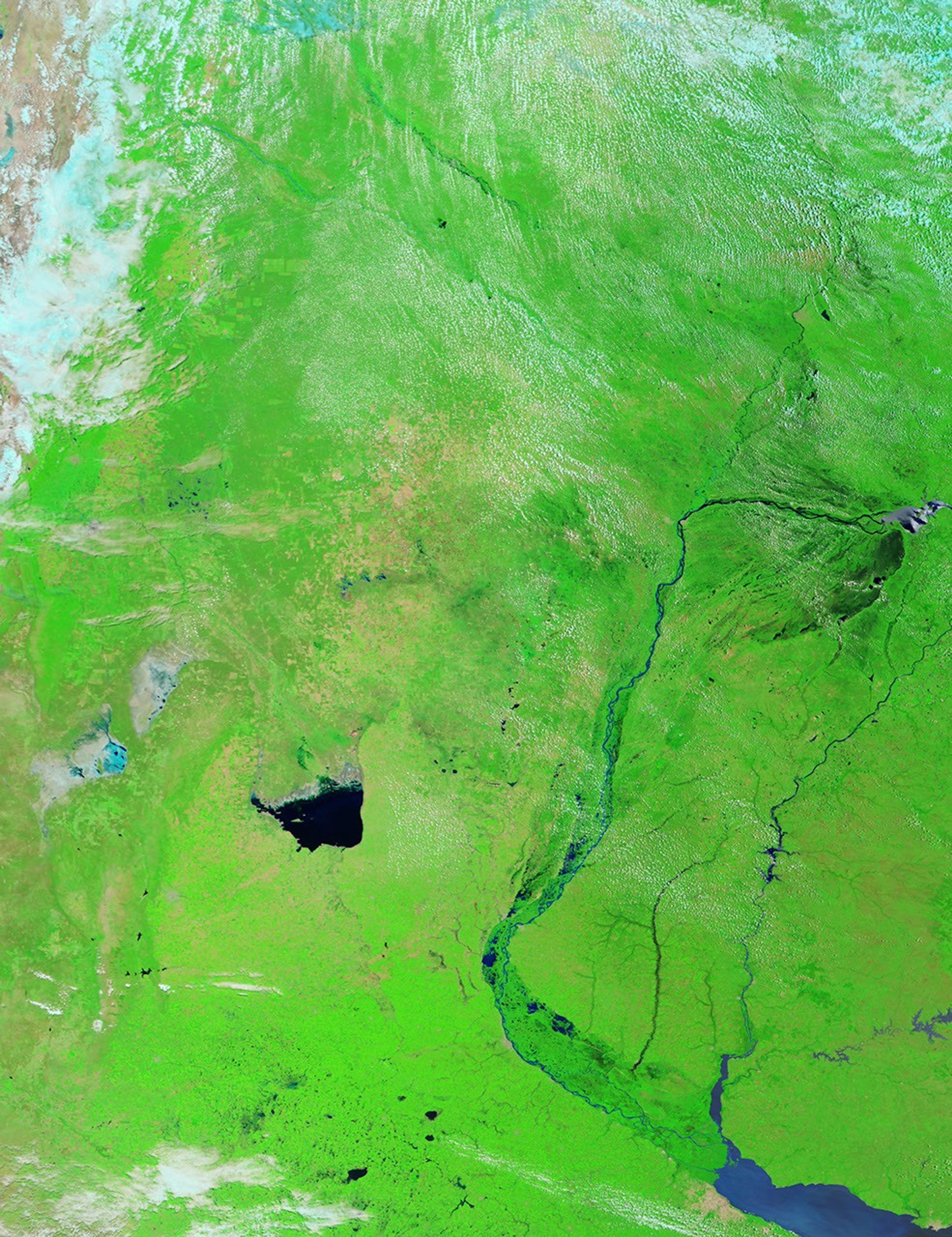 Already swollen from late summer rain, Argentina’s Paraná River and its tributaries burst their banks under the onslaught of extreme rain during the last week of March 2007. When the clouds cleared on April 3, 2007, the Moderate Resolution Imaging Spectroradiometer (MODIS) on NASA’s Terra satellite captured the top image of the floods in the Santa Fe and Entre Rios states, where the flood damage was worst. In the center of the image are the two state capitals, Santa Fe and Paraná. The cement-colored cities sit on opposite banks of the river, and both sustained significant damage in the floods.