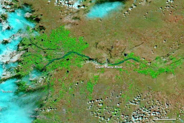 The images were made from infrared light to increase the contrast between water and land. Water is typically black or dark blue in these images, but here the sediment-laden water and muddy ground are light blue. (In the true-color version, the muddy river blends with the brown landscape that surrounds it.) Irrigated farmland is bright green, while natural vegetation and bare ground are pale green and tan, respectively. Bright blue and white clouds still cover cities along the front of the Rocky Mountains, including Denver, Boulder, Loveland, and Fort Collins.