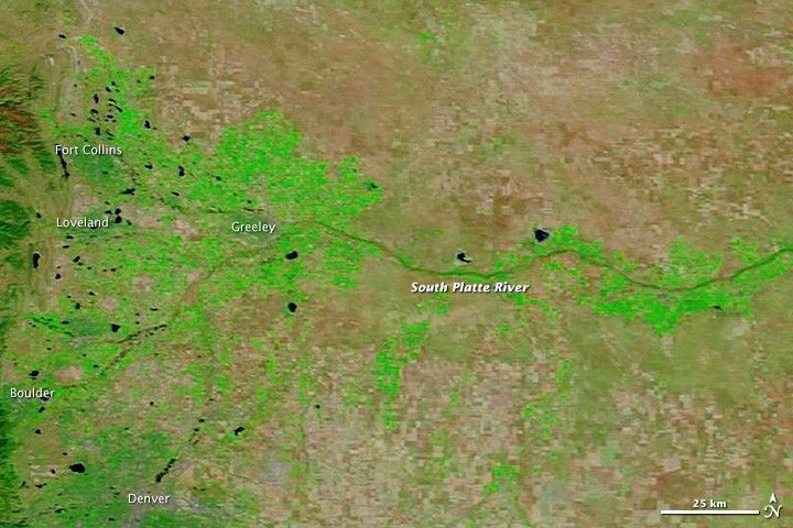 The South Platte River and its tributaries are swollen in the September 14 image. The South Platte peaked at 18.79 feet (5.73 meters) immediately east of Greeley on September 13 and was beginning to fall when the image was taken. Flood stage is 10 feet (3 meters).