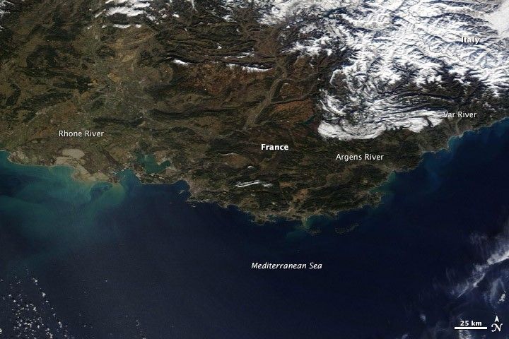 Days of heavy rain flooded southeastern France and northern Italy in January 2014. Topography and the size of the floods made the swollen rivers difficult to see by satellite, but extensive, mud-laden runoff created tan and green plumes of sediment visible in the Mediterranean. The top image was acquired by the Moderate Resolution Imaging Spectroradiometer (MODIS) on NASA’s Terra satellite on January 21, 2014. In contrast, the lower image shows normal January conditions. The floods forced evacuations and two deaths, according to news reports.