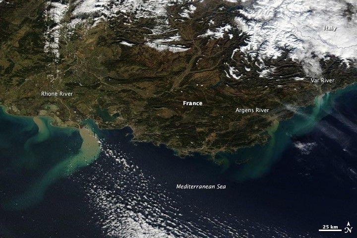 Plumes of sediment from flood runoff color the Mediterranean off the southeastern coast of France.