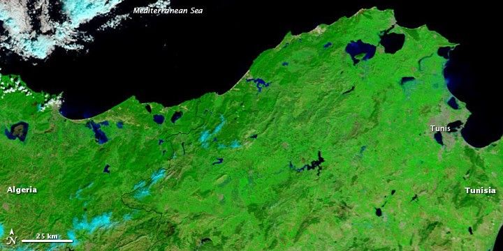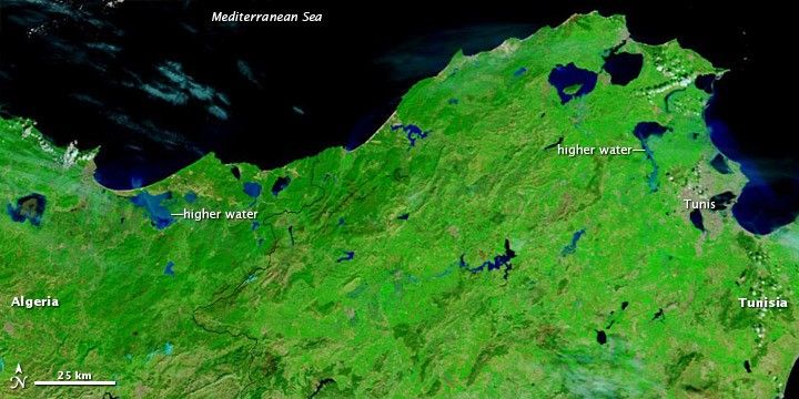 These images show the coastal region of northwestern Tunisia and northeastern Algeria. Multiple water bodies appear enlarged on February 28, and two lakes—one near the city of Tunis and the other west of the Tunisia-Algeria border—are clearly higher. The electric blue of the Algerian lake suggests the presence of sediment, perhaps carried there by flood waters.