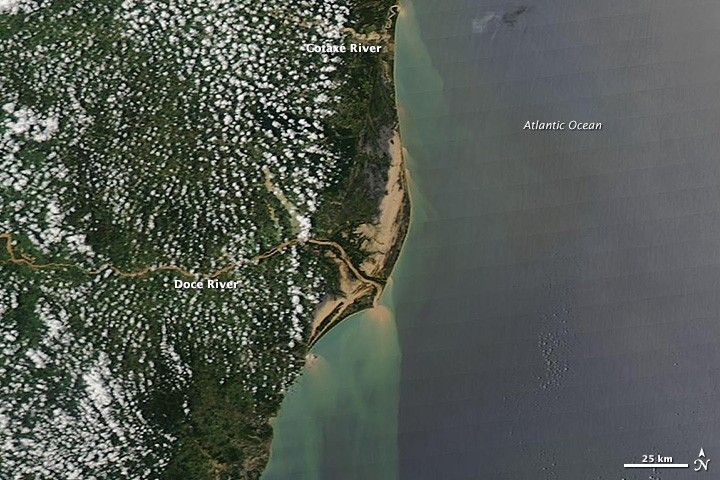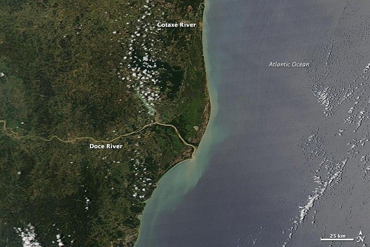 The Moderate Resolution Imaging Spectroradiometer (MODIS) on NASA’s Aqua satellite acquired the top image of floods along the Doce River in Espirito Santo on December 30, 2013. The lower image, from December 27, 2012, offers a contrasting view of normal conditions for the season. Floods are evident in the muddy, tan water that stretches for kilometers along the coast and in the swollen reservoirs north of the river. The Cotaxé River is also flooded, and brown smudges along the lower edge of the image indicate flooding around Vitória, the state capital, which is just out of the scene. The floods are sending plumes of sediment into the Atlantic Ocean.