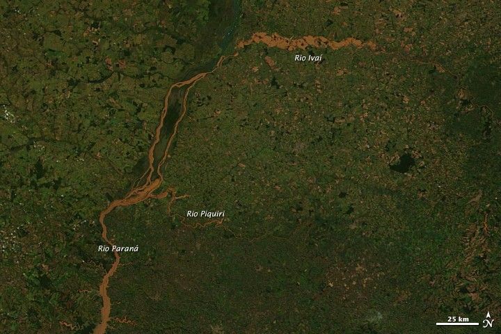 The floods have killed 10 people in Paraná, and forced a state of emergency in 130 Brazilian cities, reported Reuters. Among those cities is Curitiba, one of the World Cup host cities. The floods also closed parts of the popular tourist destination, Iguazu Falls, which is immediately south of the area shown in these images. Downstream in Paraguay, the floods are affecting more than 31,000 families, with 1,600 families evacuated from their homes.