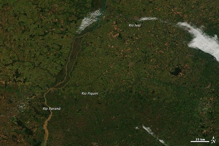 The floods have killed 10 people in Paraná, and forced a state of emergency in 130 Brazilian cities, reported Reuters. Among those cities is Curitiba, one of the World Cup host cities. The floods also closed parts of the popular tourist destination, Iguazu Falls, which is immediately south of the area shown in these images. Downstream in Paraguay, the floods are affecting more than 31,000 families, with 1,600 families evacuated from their homes.