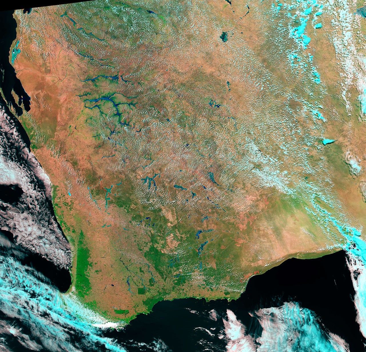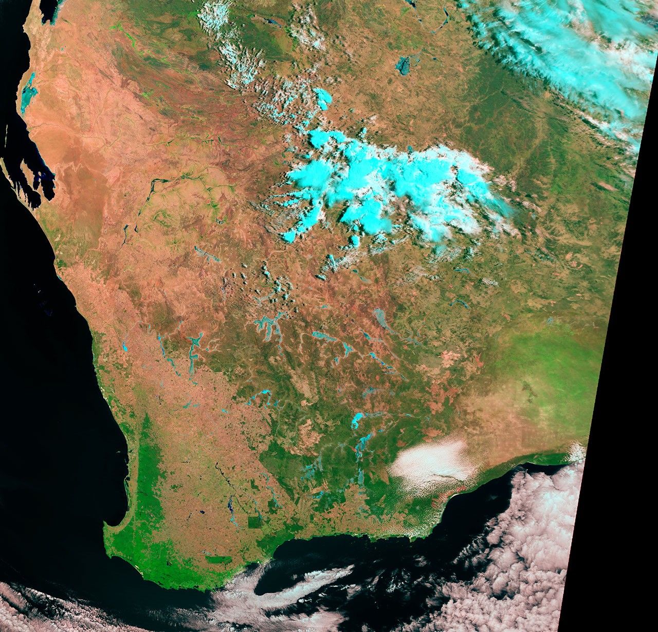 In this image, the rivers and streams in the Murchison and Gascoyne River Basins have expanded into satiny ribbons of dark blue, with pale blue streaks formed by muddy channels. These rivers are in central Western Australia, east of Shark Bay and well inland from where the storm first struck, but similar floods are apparent throughout the state in the large image. In the ten days that passed between when the top and the bottom images were taken, plants have clearly flourished with the late summer rains. The brushes of green on the arid tan and pink landscape expanded, particularly around the rivers, which almost appear to be glowing in a halo of green by March 2. Popcorn clouds drifting over the flood region are pale blue in this false-color satellite image.