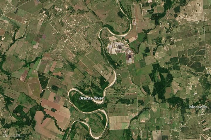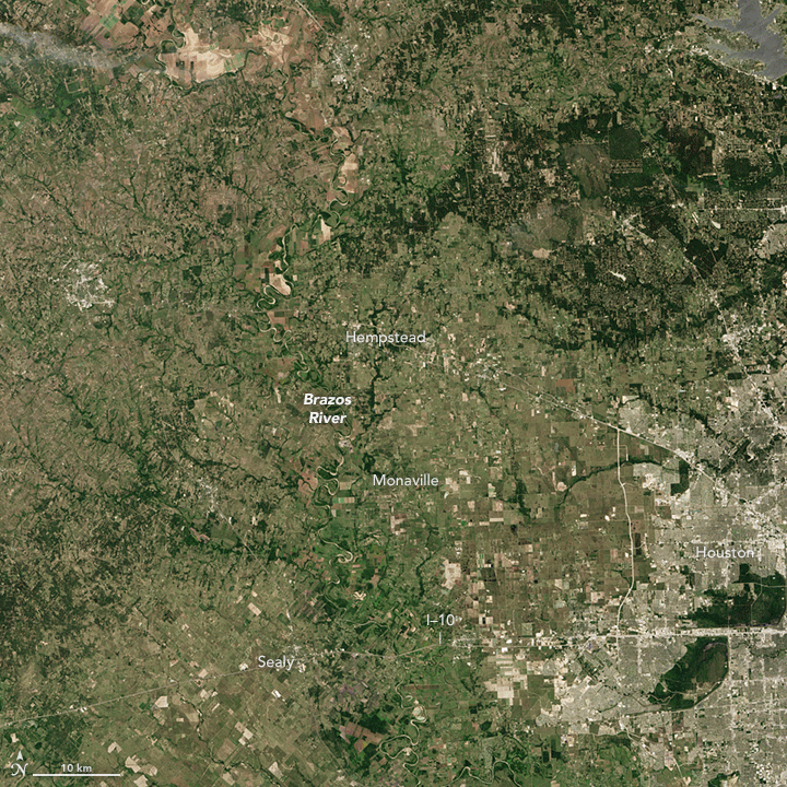 The Operational Land Imager (OLI) on Landsat 8 acquired these images of southeastern Texas on May 28, 2016 (top) and May 4, 2013 (second image). The top image shows flooding along the Brazos River just west of Monaville, while the second image shows the river when it was well within its banks. In 2014, the river nearly ran dry in places due to drought. The images below from the same days show the wider scale of the flooding.