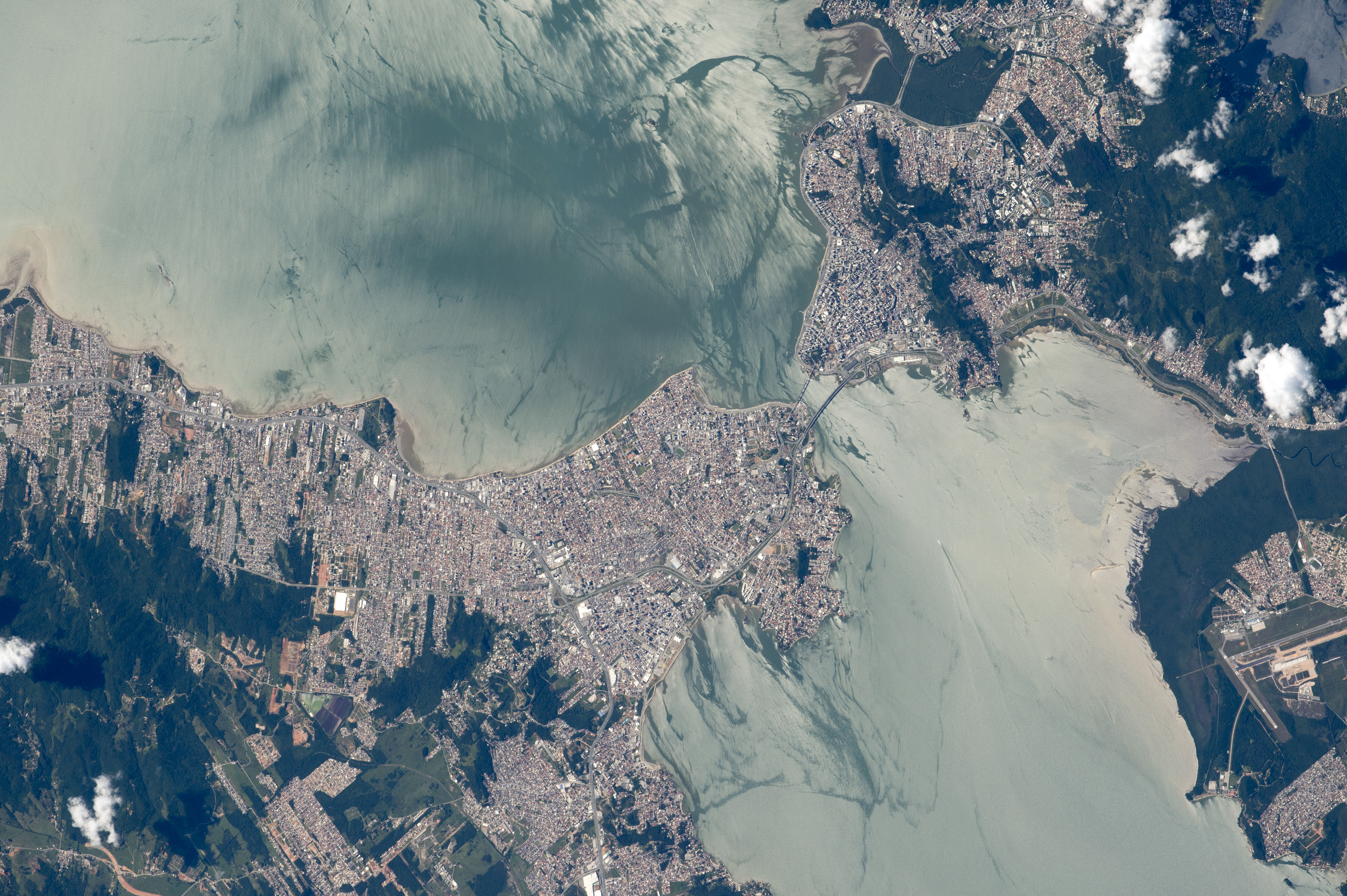 These photographs were taken as astronauts aboard the International Space Station flew over the headlands of the southern Brazilian port city of Florianópolis. The east side (top right) and west side (lower left) are joined by bridges spanning the 400-meter-wide narrows. The International Airport of Florianópolis appears on the lower right. The city has one of the highest-quality-of-life indices in Brazil.