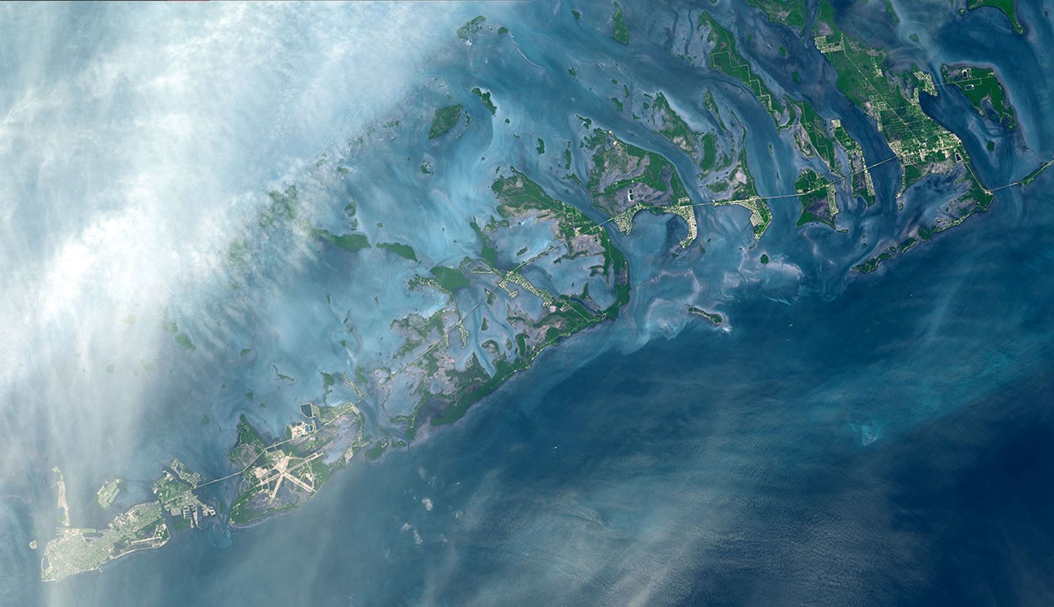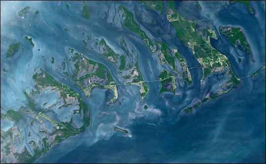 The Florida Keys are a chain of islands, islets, and reefs extending from Virginia Key to the Dry Tortugas for about 309 kilometers. Stretched out into the waters of the Strait of Florida between the Gulf of Mexico to the west and the Atlantic Ocean to the east, the keys are chiefly limestone and coral formations. In this image from the Advanced Spaceborne Thermal Emission and Reflection Radiometer (ASTER) on the Terra satellite, the keys form a mosaic of green and white against the blues of the sea. The white areas clearly show where the islands have been developed with both communities and roads. Among the roads is the causeway that connects the Keys to the mainland and to one another. The high resolution image shows the larger islands of the group at lower left: Key West (with its airport), Key Largo, Sugarloaf Key, and Boca Chica Key. This ASTER image covers an area of 51.6 x 29.7 km and was acquired on October 28, 2001.