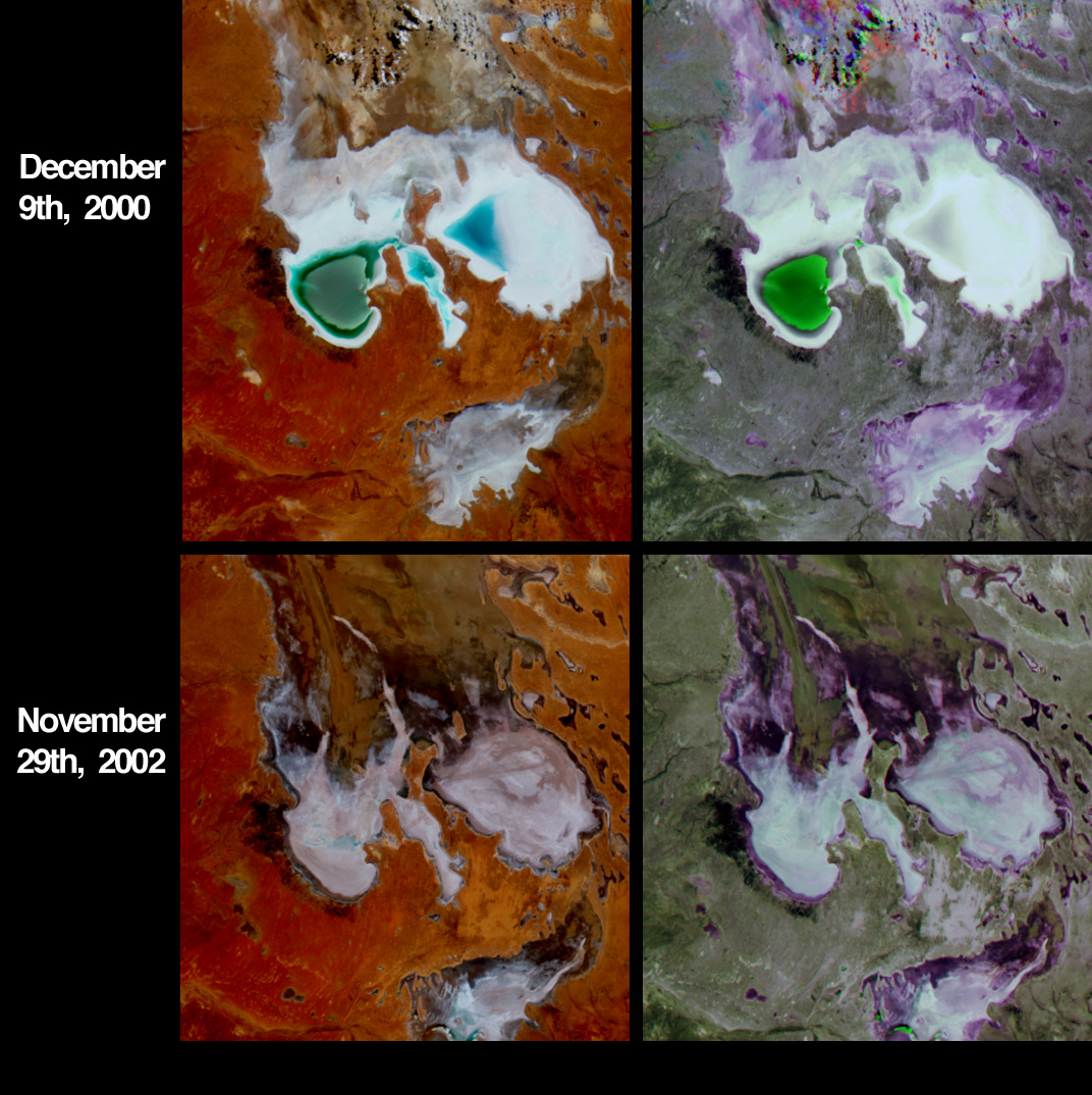 The left-hand panels portray the area as it appeared to MISR’svertical-viewing (nadir) camera, and are false-color views comprised ofdata from the near-infrared, green and blue channels. Here, wet and/ormoist surfaces appear blue-green, since water selectively absorbs longerwavelengths such as near-infrared. The right-hand panels are multi-anglecomposites created with red band data from MISR’s 60-degree forward,nadir and 60-degree backward-viewing cameras, displayed as red, greenand blue, respectively. In these multi-angle composites, colorvariations serve as a proxy for changes in angular reflectance, andindicate textural properties of the surface related to roughness and/ormoisture content. Data from the two dates were processed identically topreserve relative variations in brightness between them. Wet surfaces orareas with standing water appear green due to the effect of sunglint atthe nadir camera view angle. Dry, salt encrusted parts of the lakeappear bright white or gray. Purple areas have enhanced forwardscattering, possibly as a result of surface moistness. Some variationsexhibited by the multi-angle composites are not discernible in the nadirmulti-spectral images and vice versa, suggesting that the combination ofangular and spectral information is a more powerful diagnostic ofsurface conditions than either technique by itself.