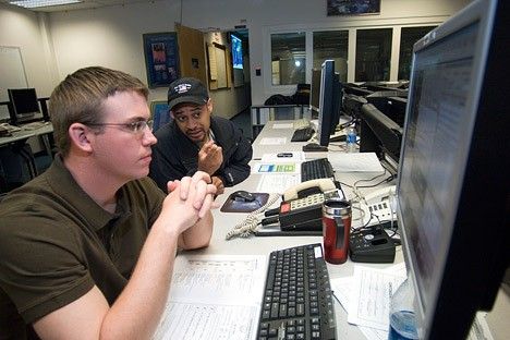 Dan Knutsen, Aqua’s flight software engineer, monitors the execution of the command sequences he developed for the maneuver while instrument engineer Carlos Hester looks on. Hester ensures that Aqua’s instruments are secured during the maneuver and returns them to science mode to collect data after the maneuver is complete. (Photograph courtesy William Hrybyk, NASA GSFC.)
