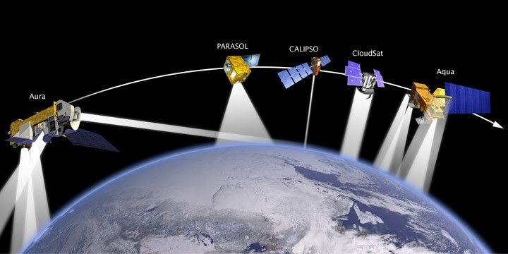 Aqua leads the constellation of satellites that make up the A-train. Aqua is closely followed by Cloudsat, CALIPSO, and Parasol. Aura is the last satellite in the group. Any adjustment in the orbit of one satellite must be accommodated by the other satellites to maintain the formation. Constellation flying enables the satellites to record nearly concurrent data. (NASA image courtesy EOS Project Science Office.)