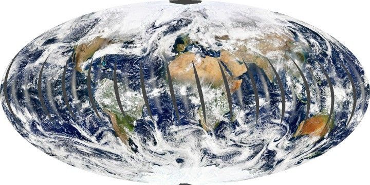Aqua’s view of Earth on March 16, 2009. The gray stripes are gaps in the satellite’s field of view between each orbit. The “pole hole” over the Arctic is the area where there is not enough daylight at that time of year to make a visible (photo-like) image. (NASA image courtesy MODIS Rapid Response Team.)