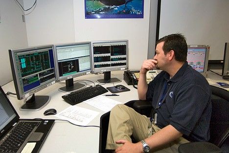 Flight Systems Manager James Pawloski oversees Aqua’s maneuver from the mission control center at Goddard Space Flight Center. (Photograph courtesy William Hrybyk, NASA GSFC.)