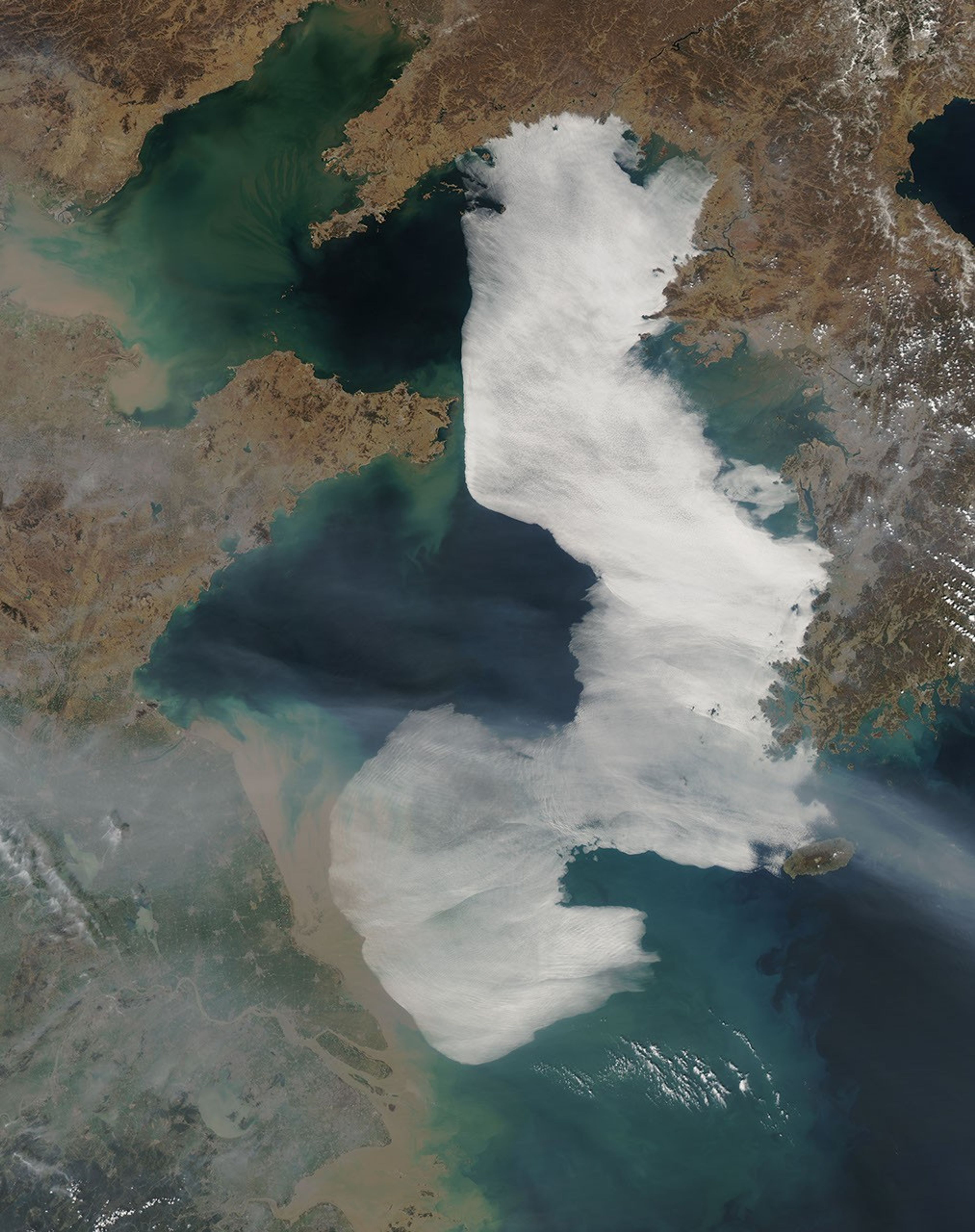 In spring, it’s not uncommon for a cloak of thick fog to cover the Yellow Sea. The shallow sea, which has a number of busy ports, usually sees 50 foggy days a year; some weather stations in the area have measured fog on up to 80 days.