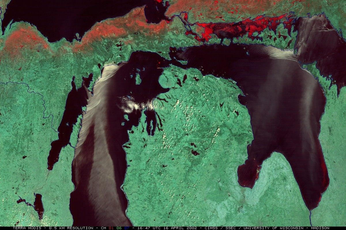 A southerly flow of unseasonably warm, moist air (temperatures of +20° to +26° C,dew points of +14° to +16° C) over the relatively cool (generally +2° to +5° C )water of Lake Michigan and Lake Huron contributed to the development of largeadvection fog plumes (caused by the horizontal motion of air) during the day on April 16, 2002. These fog plumes movednorthward during the day, eventually interacting with various land features toproduce patterns of wave diffraction and packets of reflected waves (resembling#8220;shock waves”) as the fog plumes impinged upon the rugged coastlineof Wisconsin, the Upper Peninsula of Michigan, and Ontario. These waves remainedtrapped within the strong marine layer temperature inversion which was sustainedby the continued flow of warm air across the cool water surface.